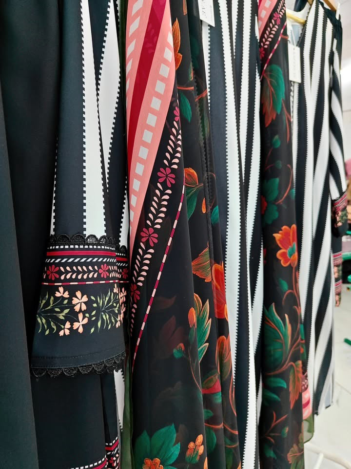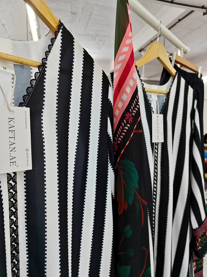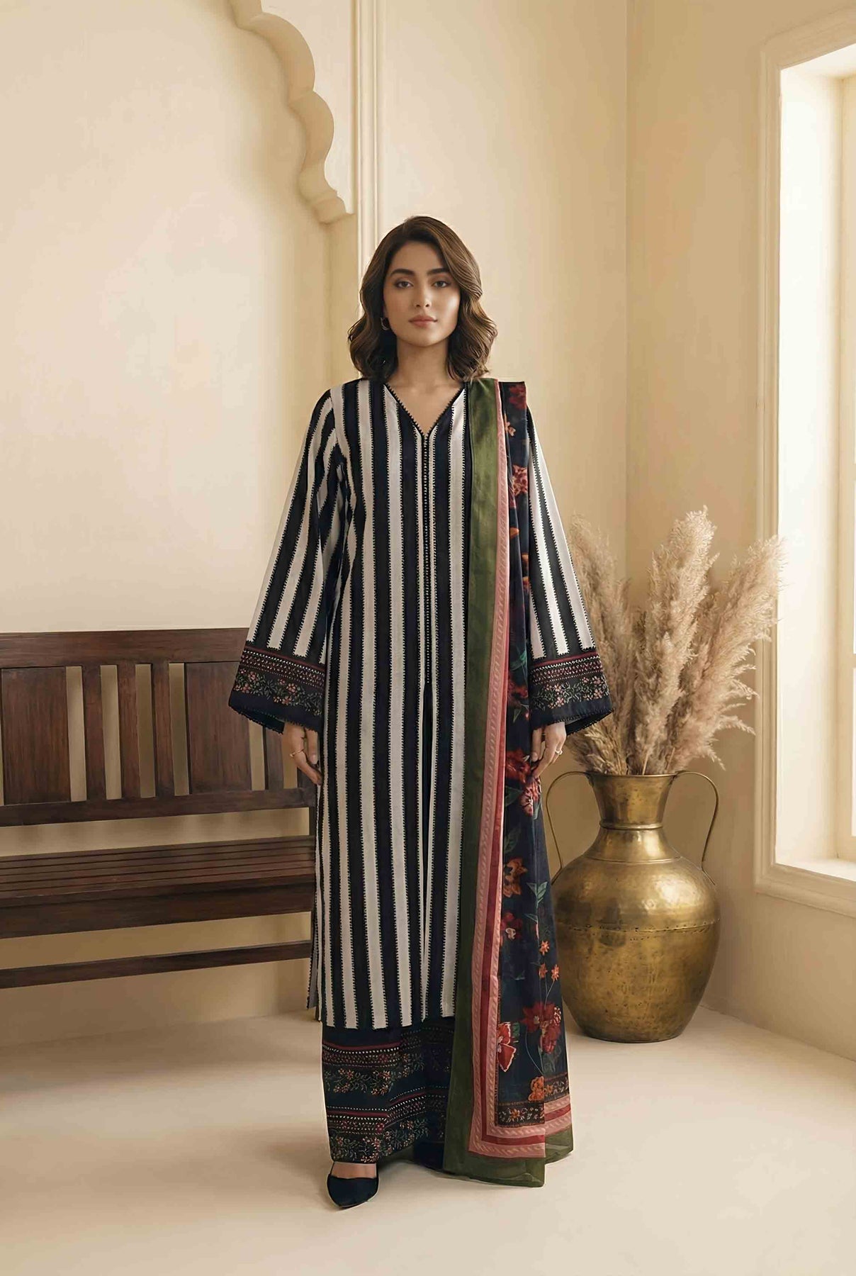 This outfit features classic black and white stripes that never go out of style. The simple pattern creates a clean and smart look suitable for many settings. Additionally, the flow of the fabric adds comfort and movement, making it perfect for people who enjoy well-fitted Pakistani Styles.