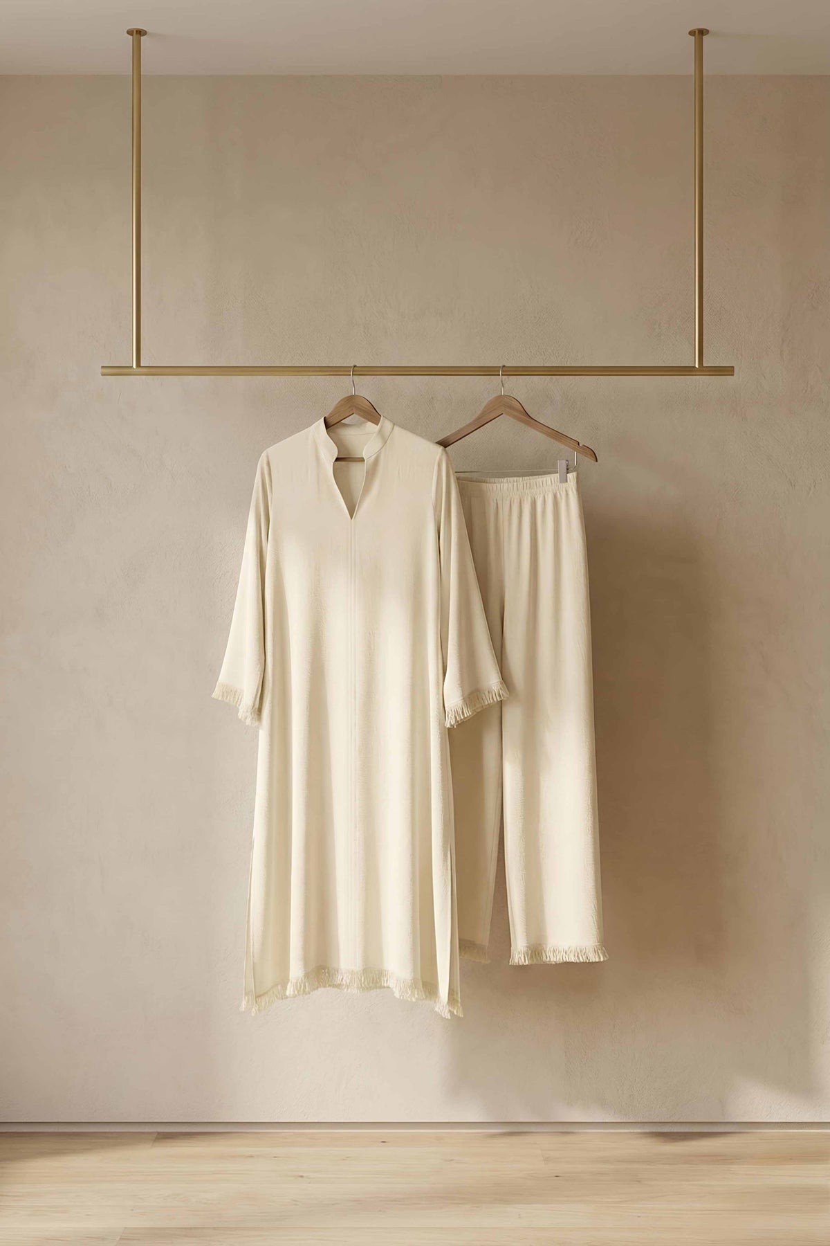 Explore the unique details of our Pakistani Co Ord Set. For instance, hand-pulled shredded threads adorn the edges. This particular technique gives a handcrafted, detailed look. Furthermore, it adds subtle charm to your daily wear. Consequently, you'll stand out from the crowd with this special design. Ultimately, this distinctive feature truly makes the set unique.