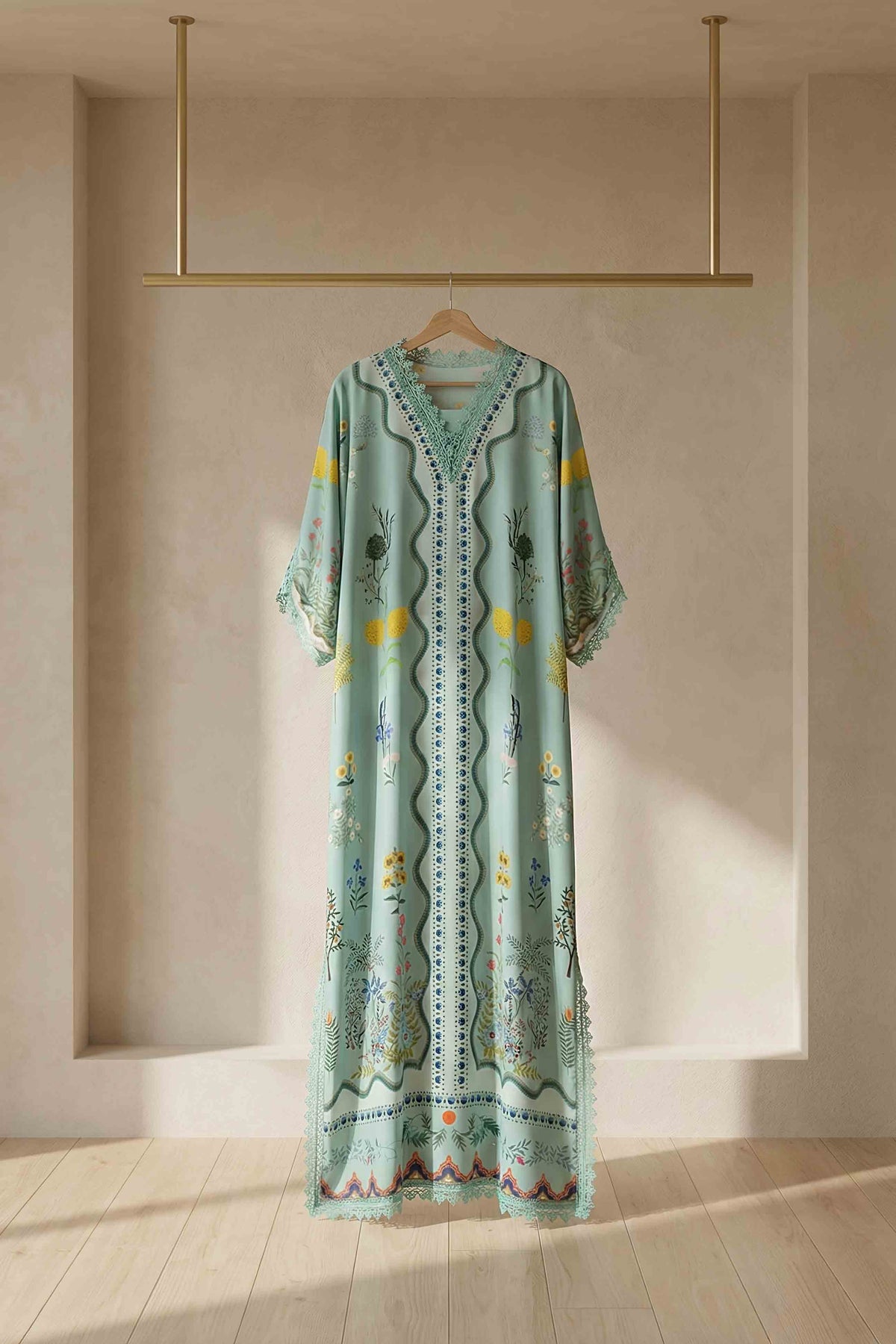 Crafted for style and comfort, this festive wear kaftan drapes beautifully over the body, creating a flowy and flattering silhouette. The intricate floral patterns are thoughtfully placed to enhance the overall design, making it an eye-catching piece. Additionally, the relaxed fit allows easy movement, ensuring you stay comfortable while looking easily chic. Pair it with statement accessories to complete your festive look.