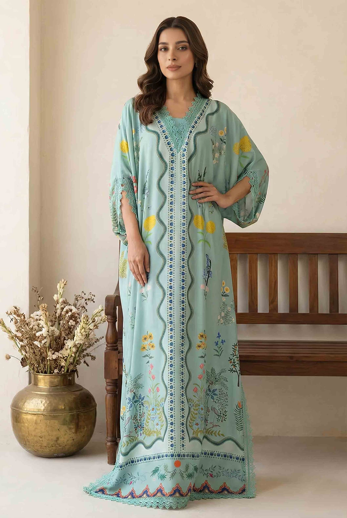The high quality crepe fabric not only feels luxurious but also adds to the durability of this festive wear kaftan. Designed to be light and breathable, it keeps you comfortable throughout long celebrations. The turquoise base enhances the richness of the multi color print, making it a standout piece for festive gatherings. Additionally, its effortless style makes it a perfect addition to your party wardrobe.