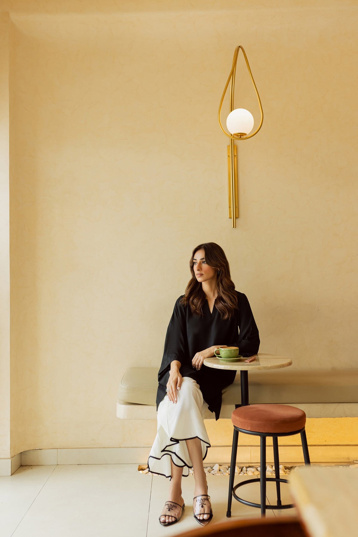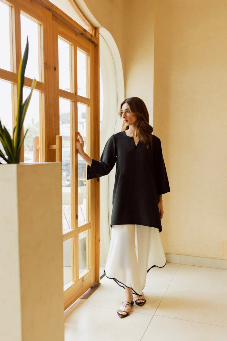 The long kurta features a relaxed fit, making it flattering on all body types. The unique hand tassel and mirror work detailing on the neck add a sophisticated touch, perfect for making a statement at any event. This Pakistani Suit for Women is designed for those who appreciate quality craftsmanship and timeless fashion.