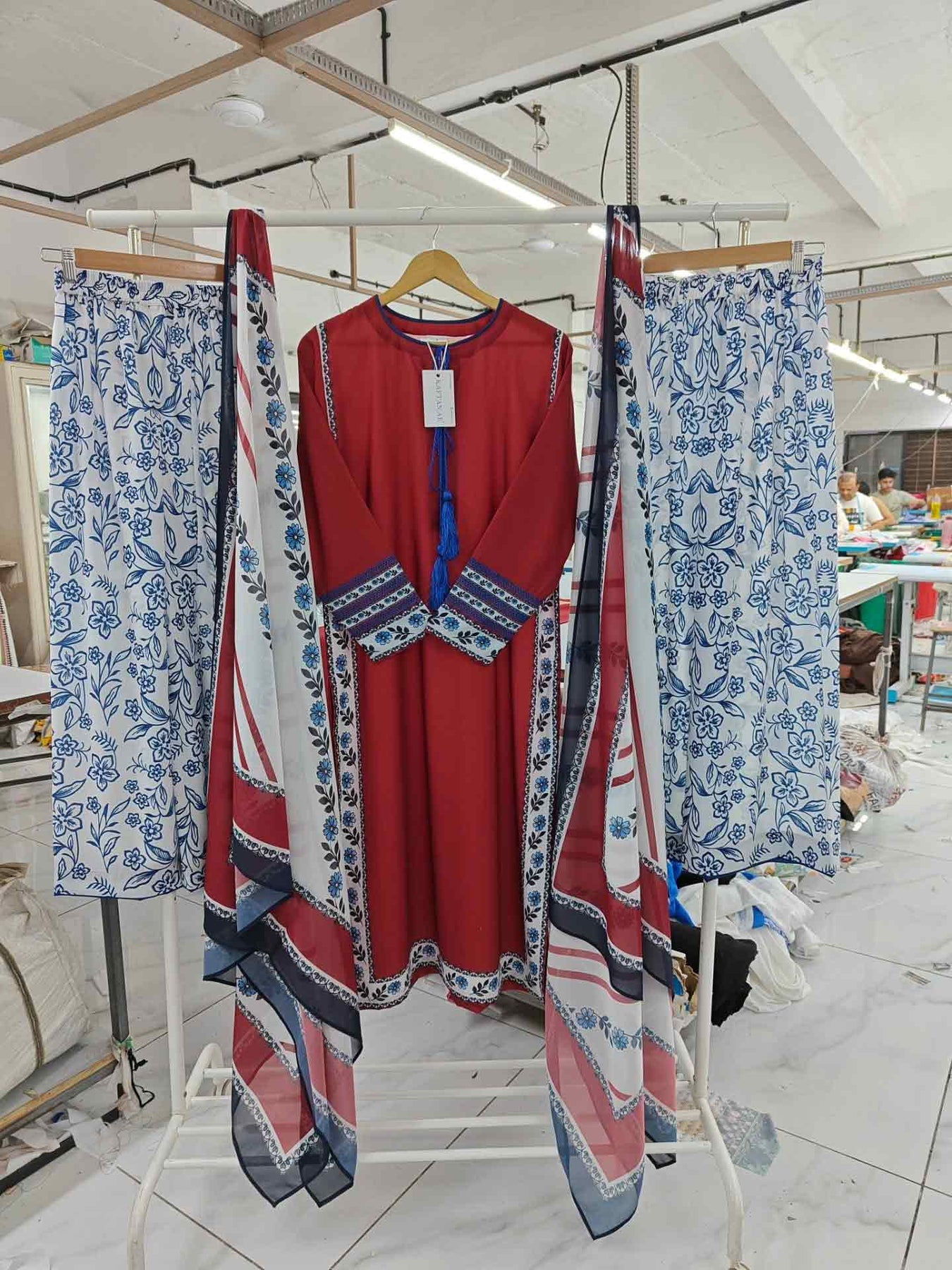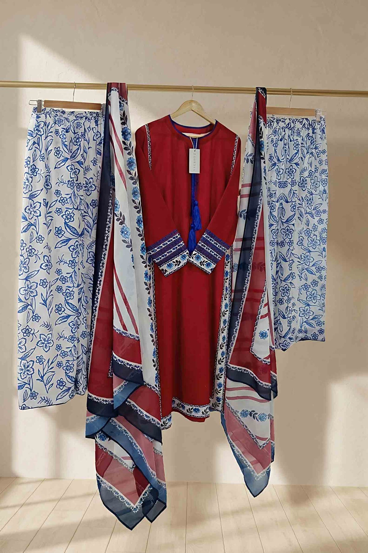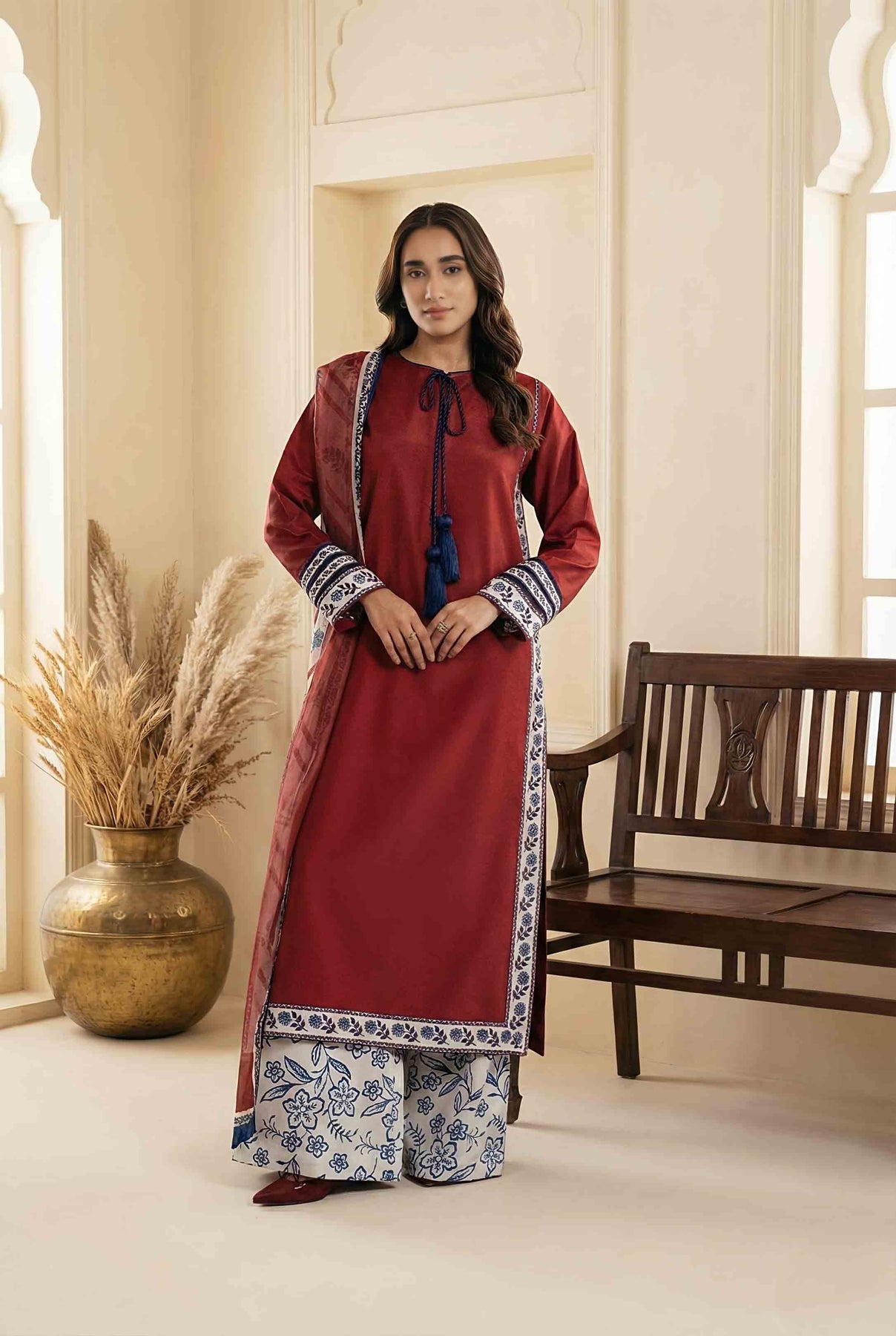 Step into confidence with this Pakistani 3 Piece Suit, designed to reflect bold elegance and timeless charm. Inspired by Latest Pakistani Designs 2026, this outfit makes a strong style statement. Moreover, the rich red base adds power and grace. This Pakistani 3 Piece Suit is perfect for women who love striking fashion.